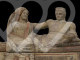 En muchos monumentos funerarios etruscos del siglo V a. C., el difunto suele ir acompañado de un demonio femenino alado que guía su alma al más allá. En esta urna, sin embargo, la figura femenina es la esposa, identificada por su gesto de desvelarse. Se trata de un elemento que hace que la obra sea iconográficamente excepcional.